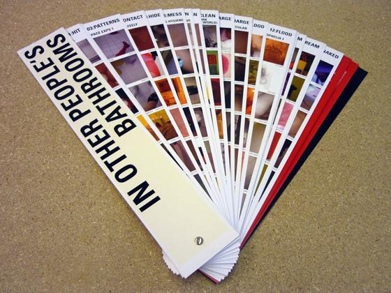 For the project In Other People’s Bathrooms (2008), which was part of an exhibition at Mars in Berlin, Chanel took hundreds of “selfies” in, you guessed it, other people’s bathrooms. These intimate photographs taken in an intimate space are made public by way of the publication. Leafing through the floppy pages, the book takes the form of a Pantone swatch book, is as awkward as trying to take your own picture in a confined space. The resulting publication is not simply a camera-dump of exhibitionist snapshots; the photos have been meticulously organized into twelve categories and are accompanied by text, both paired with images and on the back side of the image pages. The text corresponding to the photos complicates the reading of the images; for example the Psycho-laden anxiety evoked by the pictures in category 13:Murder titled “Suicides, Rapes, and Death in General,” the lacy, antique quality of the pictures in “8:Pet; Grannyphilia” to the art history references present in “03:Patterns: History of Art in 12 Easy Steps,” quite a range of subjects for self-portraits taken in bathrooms. The text on the other side of the image pages investigates the category topic itself with dictionary definitions, synonyms, and sentences providing examples of the words’ different meanings and usages.