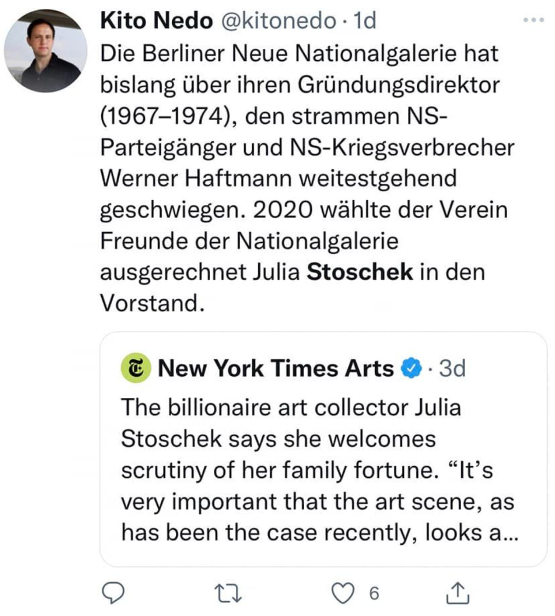 Well, now that artists and cultural producers are starting to speak up (Edwn An here in a recent social media post) and withdraw works from her collection, Hito Steyerl for example, who is in the process of buying back her piece, maybe a progressice collector like JS will be more open to talk about reparations and the ongoing denazification process in Germany and especially in the German cultural scene.