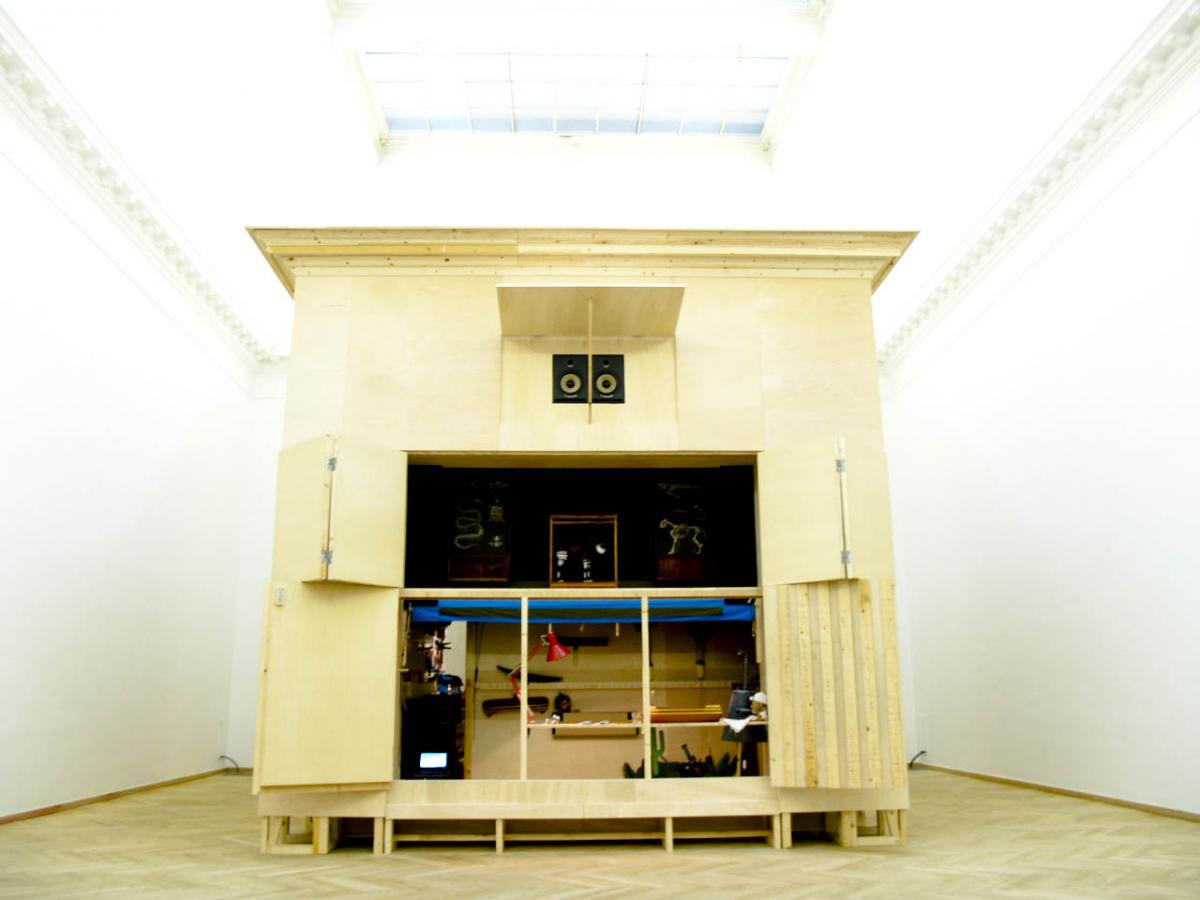 Simon Starling, The Expedition, 2011, Wood and glass construction; puppets, stage set, lights, audio equipment and additional paraphernalia.