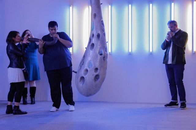I was interested in our relationship to spirituality and how we think about afterlife. Partly it was because I met a sound therapist in Berlin who had all this fancy equipment in his apartment that looked to me very science-fictiony, but also very unreal. It seemed like a weird combination of New Age and technology. And for the last 5 years I have been doing séances in various situations in which I try to communicate with the spirits of extinct birds. In this show, as I was making the ceramic little whistles that go inside the sculptures, I came across the information that whistles were very important instrument in pre-hispanic, pre-colonial world in the Americas, and in the Mayan area a lot of bird whistles were found in graves. The question of why would that person need a whistle, especially a bird whistle, was an inspiration for me to finish the aesthetics of the work. Even though my original inspiration was more about New Age things, the end result was about this relationship between whistles and the pre-colonial world in the Americas.