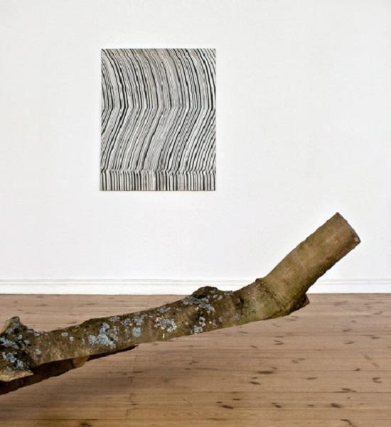 Arne Schreiber has been putting countless parallel lines on different surfaces for more than ten years now, and in this exhibition, he introduced a new motif in oil on canvas, as well as a drawing on the wall made with markers. What makes the exhibition especially exciting and unique are the long invasive trunk-halves of a maple tree. They are positioned on the floor of the gallery room, more or less diagonally, so that they divide the room in two halves, thus engaging the space into this geometrical play. They also act as barrier, and directly affect the use of the space and modify its perception. The barrier disables scattered wandering, and structures certain paths. The precise cut in the middle of the tree gives its organic form more of a straightened, clean appearance that acts as a counterpart to the lines on the canvases and the wall - as if the trunk halves are those exact lines magnified - with a bumpy layer of human interference.