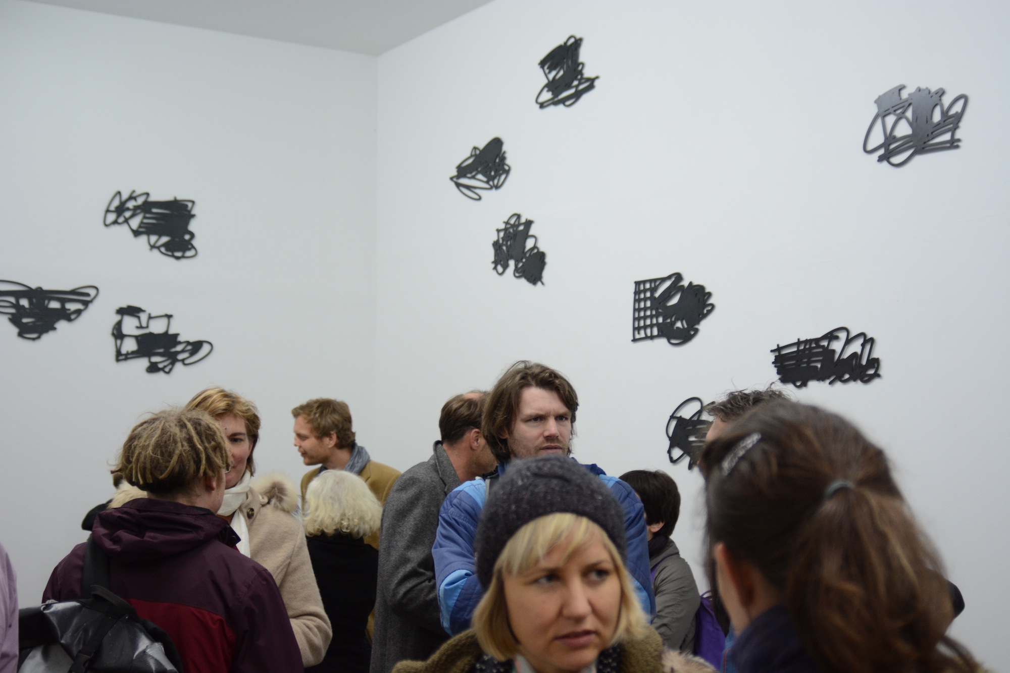Anthony Werner’s iron “drawings”and canvas painting inhabit a similarly simultaneous space. Script-like and borderline-legible, the comparisons between Werner’s work and a stealthy nighttime tagger’s graffiti across the East Side Gallery is obvious, and the questions raised similar: how do we read these almost-fontfaces? Yet, the sculptures are detached from any person or persona – at times, they look like a collection of botched attempts at forging different signatures. Unidentifiable but nearly legible, they represent the literally nonrepresentational – a Master’s Thesis project on scribbling.