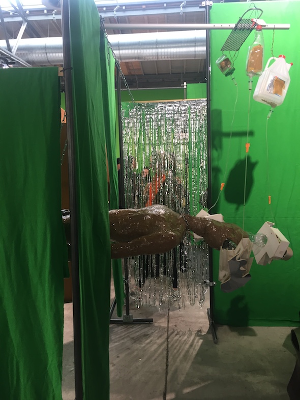 A similarly cloaked display is found just across the way, at Sprüth Magers. The installation is particularly hard to miss, with its maze of bright green fabric partitions and the myriad objects that fill it. The free flowing fabric draws visitors into its folds, wherein they find a strange laboratory of various items and materials that float, hang, stand, and mobilize all around them. It seems to contain its own environment: a chaotic bricolage that somehow offers respite from the whir of activity just beyond its enclosure.