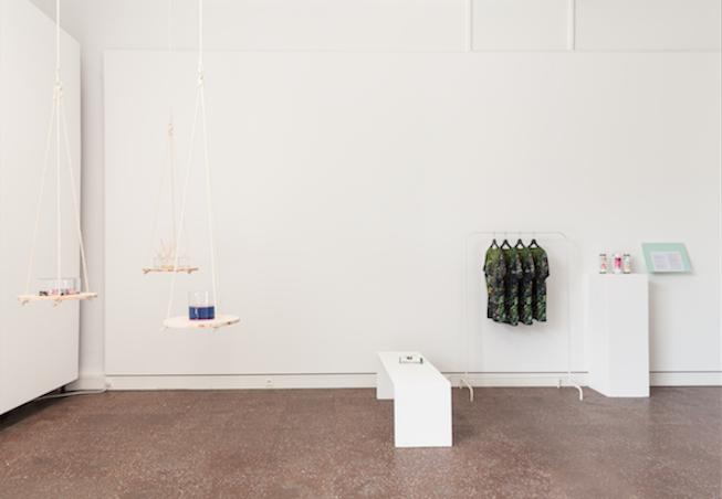 This interview text is located towards the end of the exhibition, beside a display of candles and a rack of hanging shirts. Arranged to evoke a concept store – as the work by Kathrin Günter, which includes the candles and Celebrity Tarot, is referred to – or a souvenir shop, this section of the exhibition ties in the commercial underpinnings of spaces for recreation, taking them as parks in their own right. Whether an object is purchased or not, they provide another experience that calls to the senses: enfolding visitors in an intoxicating mixture of textures, scents and kaleidoscopic arrays of color. It is in the intricate mix of distinctive elements, prompting the examination of what defines a space for leisure, that the exhibition opens up the term 'park' – guiding us through, facilitating our experience of it, while leaving it open for our own wanderings and further contemplation.