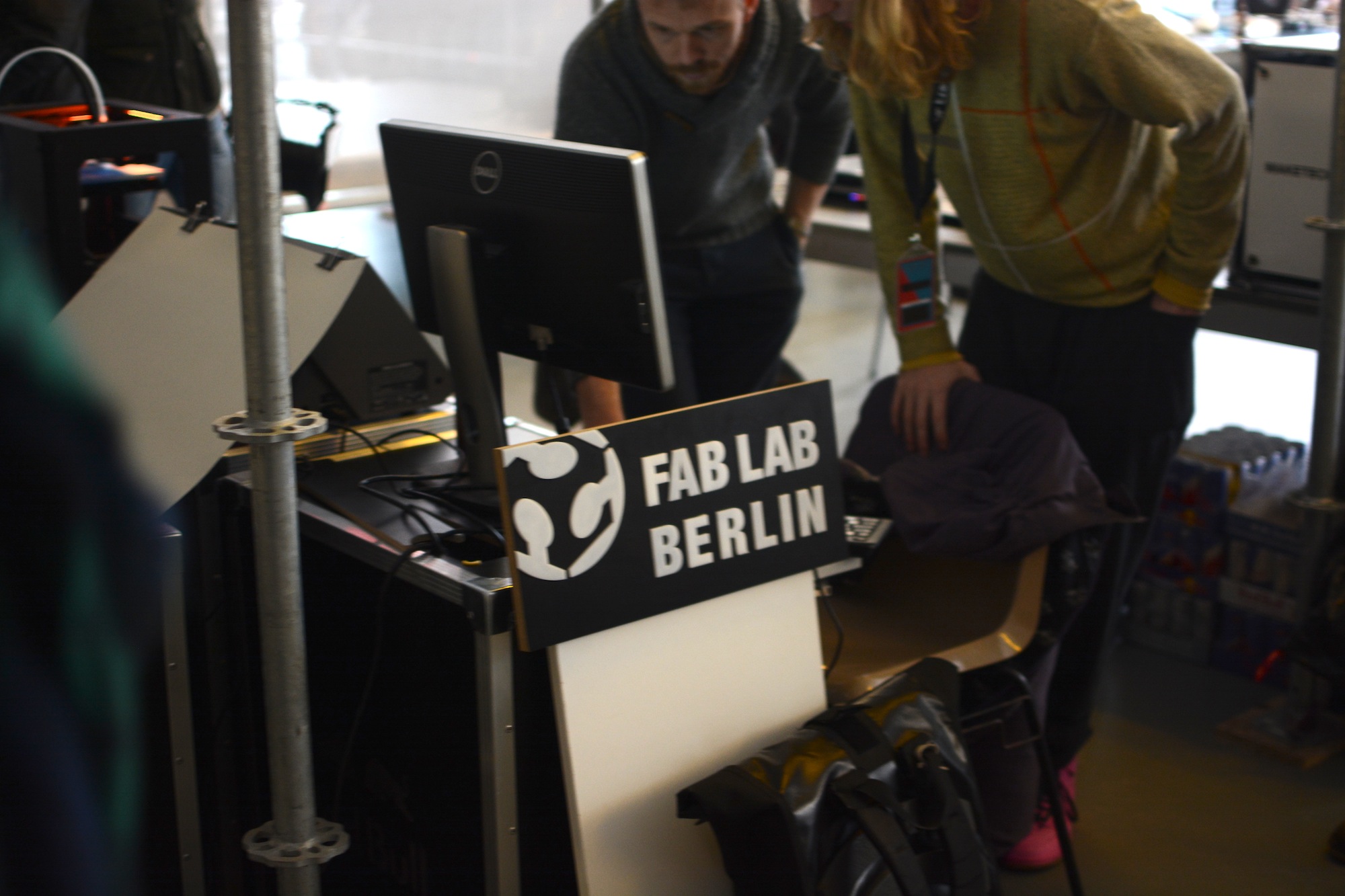 The room was fully unfinished. A mess of cords, pipes, and curtains, the projects were still in-process, and the room reflected the not-there-yet nature of the hacks. Instead, the space reminded me of a Berlin club, with neon lights of various colors glowing across the ceiling, exposed piping forming the guiderails and boxes made into staircases.