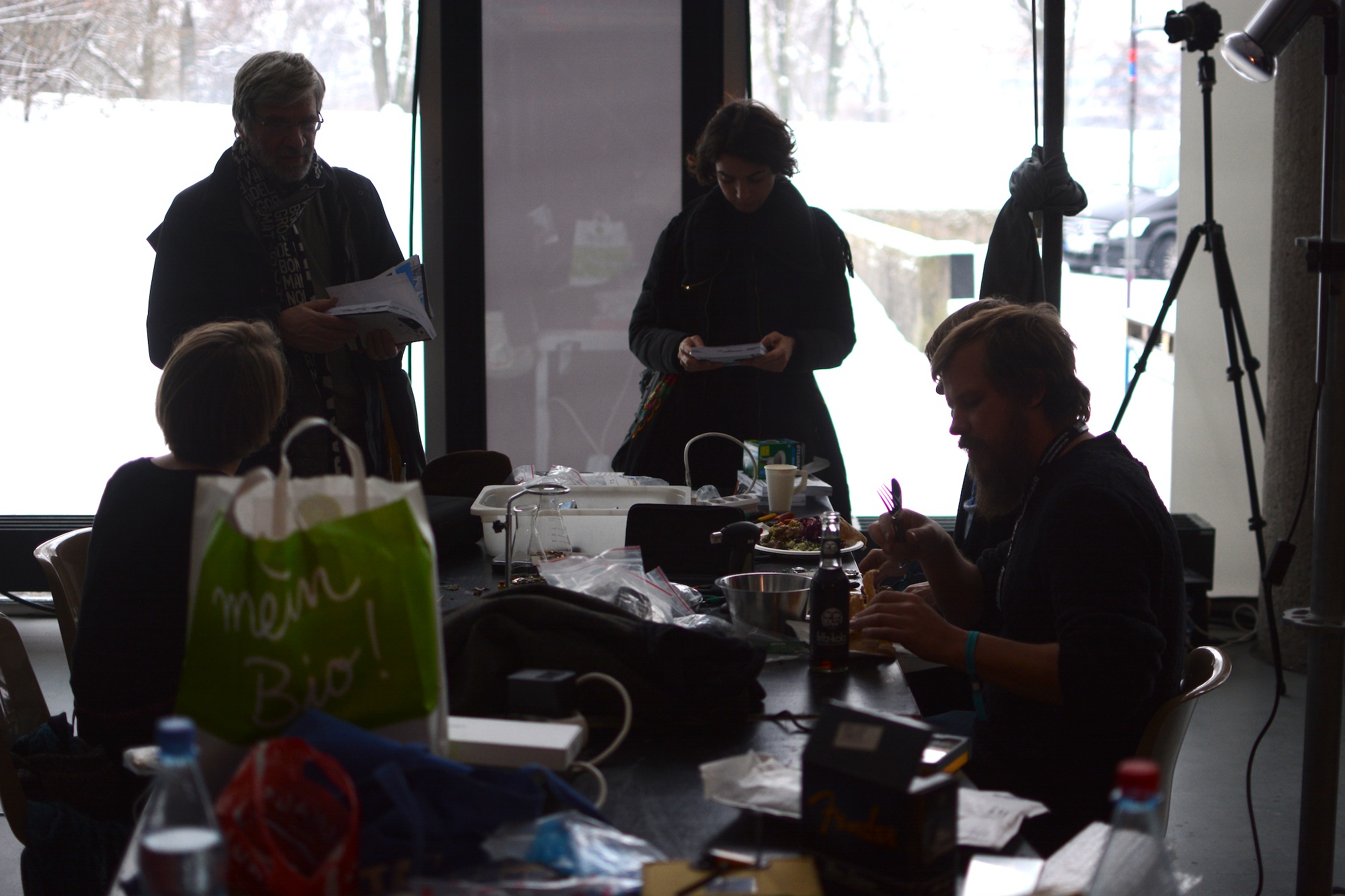We were then introduced to the Hack-a-thon taking place in the next room over. Featuring more than 70 participants, the transmediale hackers were taking a break from hacking away at their laptops, motherboards, and other gadgets as we walked in. Instead, they were helping themselves to the impressive spread of a mediterranean buffet (The journalist previously mentioned was last seen here, skipping out on the film screening. Priorities!)