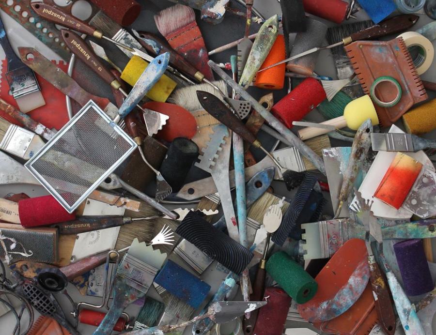 WHY: In his exhibition „All for one“, Futo Akiyoshi focuses on the tools for painting. For his series „something too much“ the artist uses as many tools as possible in one painting. By contrast, only a single color is selected for each work. The harmony of the image is composed not only by colors and shapes but also by various textures. These diversity, limitation, and harmony constitute the rule of this series, and the rule itself is the aim of these paintings.