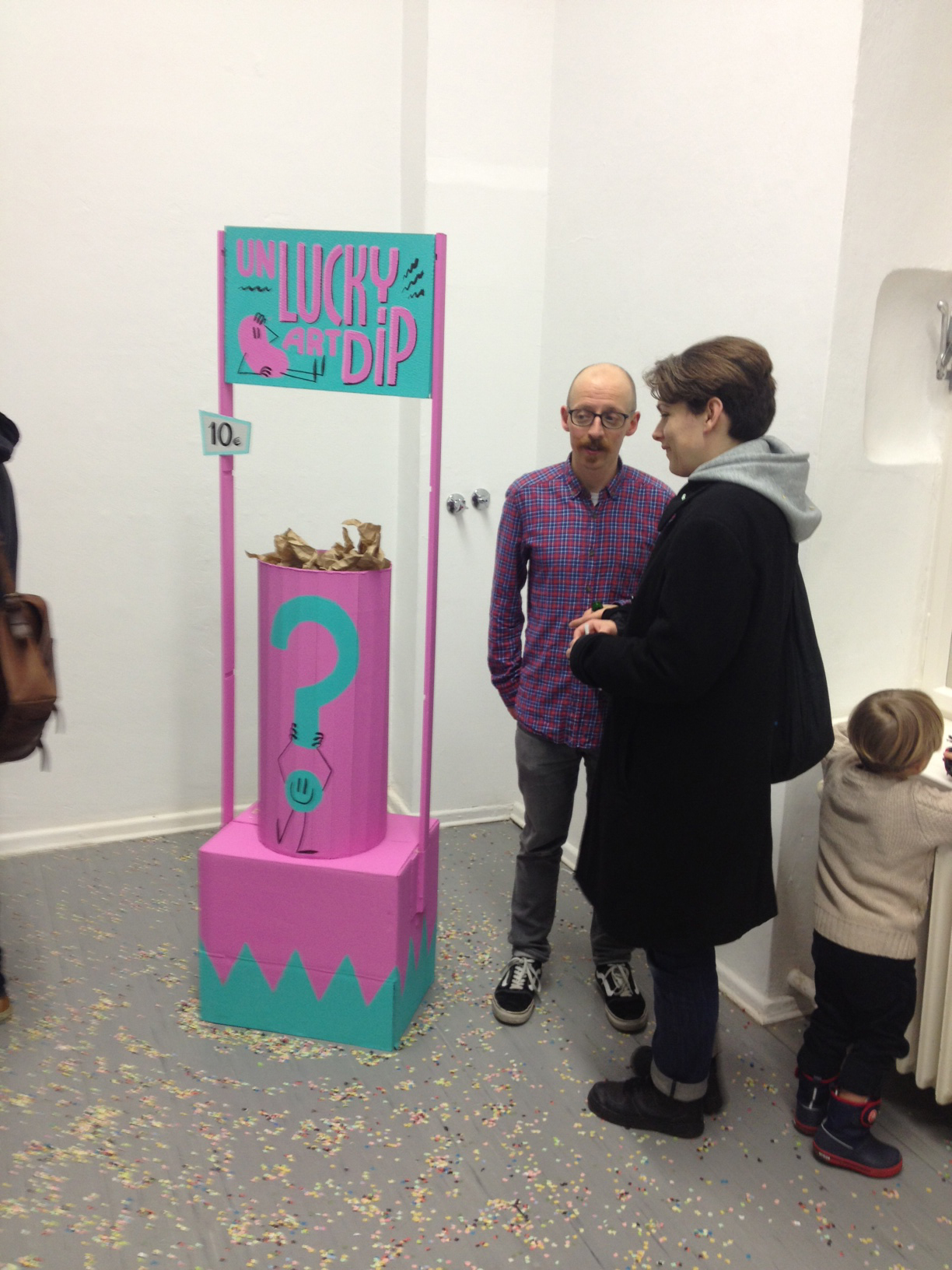 This group exhibition includes some heavy hitters from the graffiti world, which is never an assurance the work will be as good as their outdoor stuff (the best graffiti is still generally found on the street). There exist here, some exceptions on both sides of that coin toss. But the spiced cookies and Glühwein kept spirits high. Plus you could pay 10€ to take an ‘Un-Lucky Art Dip’ for the chance to scoop a masterpiece. And more people with dogs. What’s with the growing trend of bringing your dog to an opening lately? Maybe it was the fog. +12 for Brad Downey’s video. (C)