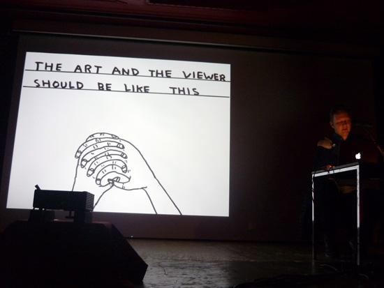 +25 for managing to make the crowd laugh for 45 minutes straight…Was his talk really about “interesting things” as advertised? Well to be honest not really; if you only had his text to read, nothing substantial was actually said. Most of his comments about his life as an artist were pretty banal (for example, “artists like to make a mess”) BUT the way he presented these statements along with images of his goofy drawings was pretty hilarious and definitely “interesting”.