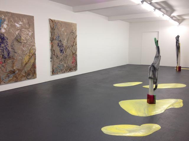 A double show featuring a frozen liquid yellow piece on the ground, a work by Christopher Fülleman. On the walls paintings by Jens Einhorn. Vigorous and with a sense of vulnerability.