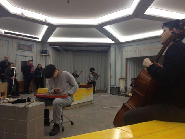 One night, two performances. A group of musicians improvising together, every15 minutes in a new direction. From bittersweet to moody, lazy, and doubtful; this night brought everything. The second performance: an installation of a dying brick (so he said) and a videoscreen of zoomed body elements.