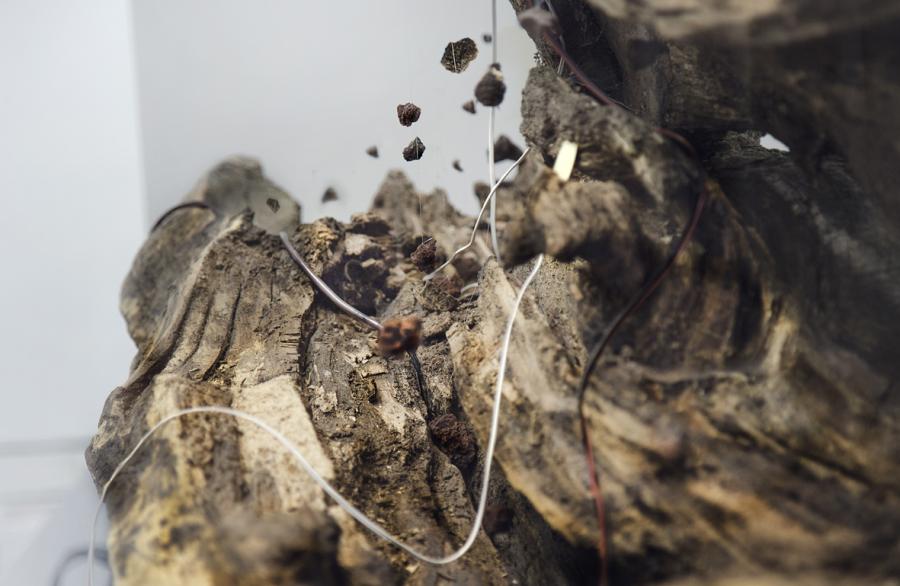 Movement is a central motif in Gil Delindro‘s kinetic sculptures. The artist uses predominantly natural materials, working with them to render processes of change, touch and resonance acoustically perceptible. His works for A Grain Within a Cloud of Dust relate to his research at the Algerian-Moroccan border in the Sahara, where he used performative actions and experimental field recordings to approach a landscape that is extremely dry and inhospitable: reduced, and at the same time vast.