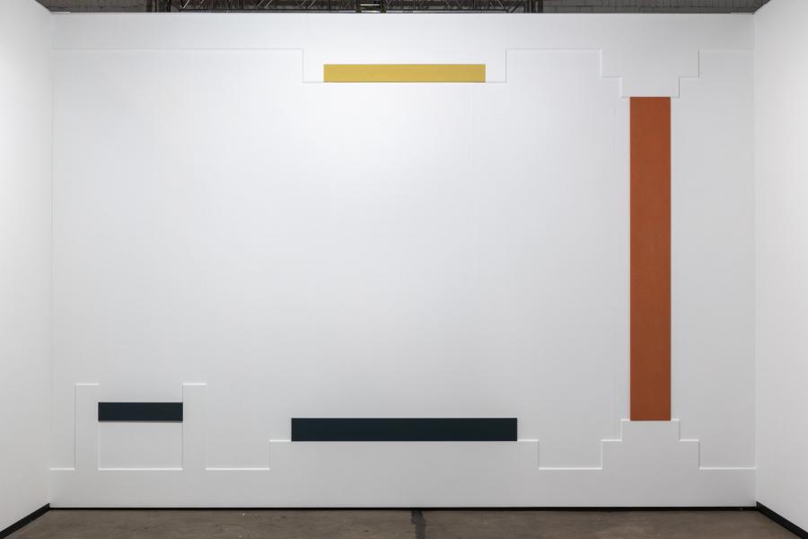 It’s always a challenge to introduce your artwork into the public space. Particularly so when you work within the field of expanded painting. For our recent wall work Elodie Seguin has defined a unique approach which explores the relationship between several painted objects as well as their organization within and their relation to the given exhibition space. The effect is color as an evocative volume - depending on how it is confronted. In its reductivist tendencies Seguin's work reveals an obvious affinity to the minimalist tradition. Nevertheless there invariably remains a spontaneous, experimental dimension to her process, building and conceiving the installation during the painting itself, by trial and error.