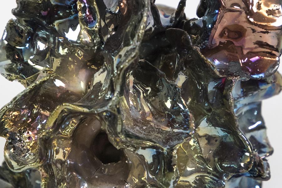 Dozens of organic, aqueous forms are littered around the galleries themselves. These are ceramic artworks made by Wendelin titled ONLY ONE, TWO, THREE … counting upwards in numeric evolution. Despite their raw contours and appearance of natural proliferation throughout the space, these are hand-pinched and deliberately placed sculptures. Here as thousands of years ago, they are the product of ritualistic methods, the practice of which could be thought to hold some part of the time concentrated within their making. Their abyssal lusters are the result of a chemical-induced glazing technique called raku. To achieve these, the sculptures are removed from the kiln at their peak temperature of more than 1800 degrees and placed in metal containers full of paper that combusts upon contact. The resulting carbon compounds extract otherworldly colors from the suffocated glazes. Charred remnants of paper appear in traces around the sculptures. In their virgin form they are pages from the publication pasted in the gallery windows, which have also been placed in geometric stacks throughout the exhibition to be taken.