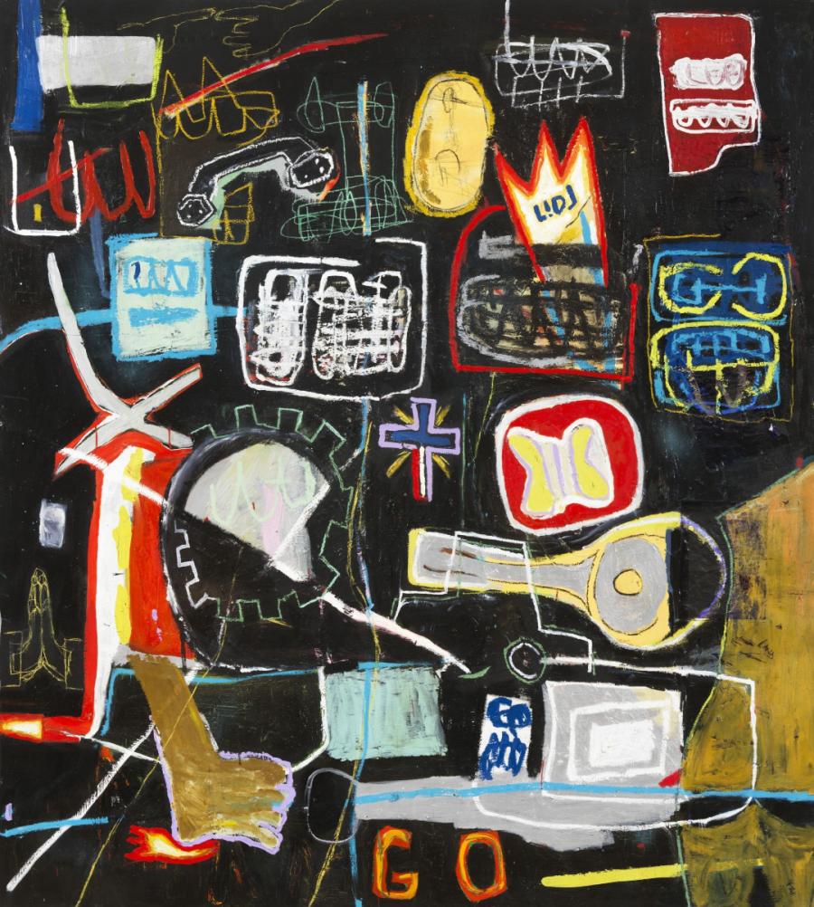 D’Guilherme identifies as part of a Neo Brut movement—a cocktail of New Brutalism and art brut—creating visual landscapes, tablescapes, and nightscapes depicting city life in Berlin while also taking inspiration from the substantial time he spent developing his practice while living and working in Lisbon, Portugal. The artist aims for his paintings' purest form of creative expression, blending rawness and precision. As the title No church wild, with its nihilistic implication of no meaning, value, or purpose in the world suggests, D’Guilherme’s work thrives without strict labels, including devalued art-historical references and layered iconography, as in the title piece, which feels like a slick apped-out smartphone screen reflecting on the world around us and how we navigate it with intuitive awareness and recklessness. His art and attitude resist conforming to predetermined narratives and locations, often manifested in words and short texts layered and tattooed into surfaces and materials pulled from varying unconventional sources.