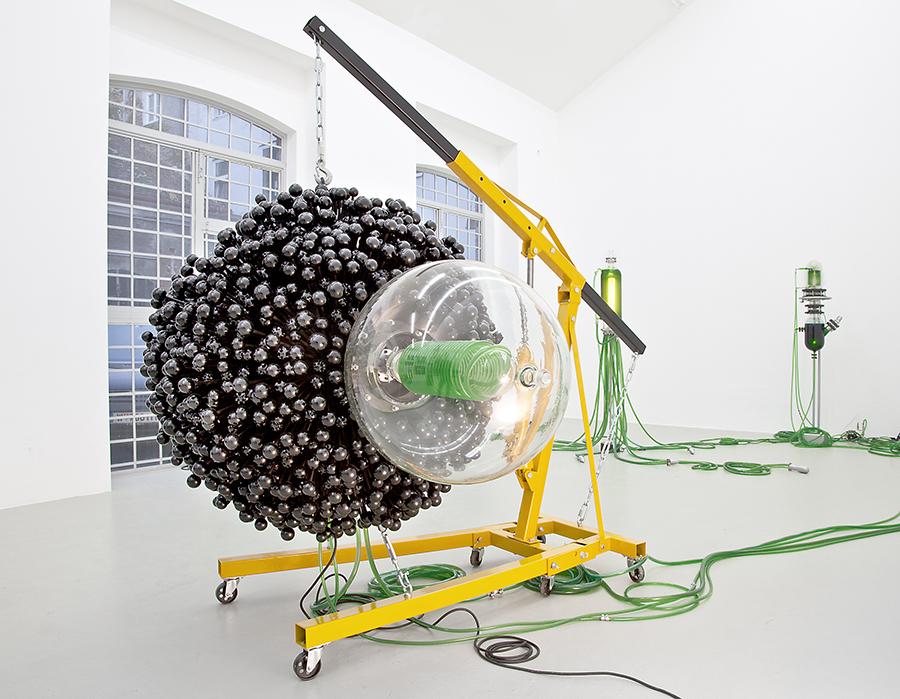 For his exhibition METABOLICA at SEXAUER Thomas Feuerstein will create an autonomous art world. He carbonizes Algae hydrothermally in a pressure reactor – a processual sculpture which is in the exhibition – manufactured for this specific purpose. He uses the coal he extracts to make charcoal pencils, which in turn he uses to create the drawings for the exhibition. This procedure also has an economic element: if Feuerstein no longer has algae, he can no longer draw. All resources are finite in his autonomous art world. In another example Feuerstein irradiates a Haematococcus pluvialis (in german: blood-rain algae) – also cultivated in a sculpture – on a picture surface with ultraviolet light. Eventually, the green alga turns red, dries, and finds its final state in the picture BLUTREGEN (blood rain). Using biological and chemical processes, Feuerstein thus creates an art world of captivating but also irritating beauty.