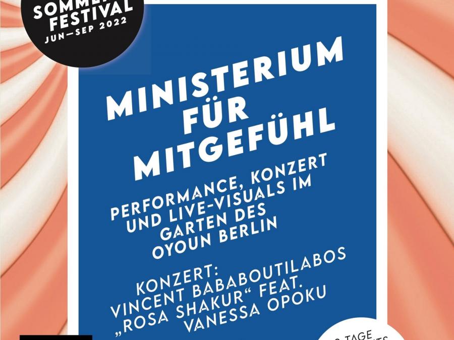 The Ministry of Compassion invites you to the garden of Oyoun. The ministers of the collective, which emphatically resists social coldness and the brutalization of language, answer questions on the topics of compassion, empathy and grief. The band "Rosa Shakur" around the musician and activist Vincent Bababoutilabo rounds off the evening together with live visuals by the artist Vanessa Opoku. A musical project at the interface between art and politics.