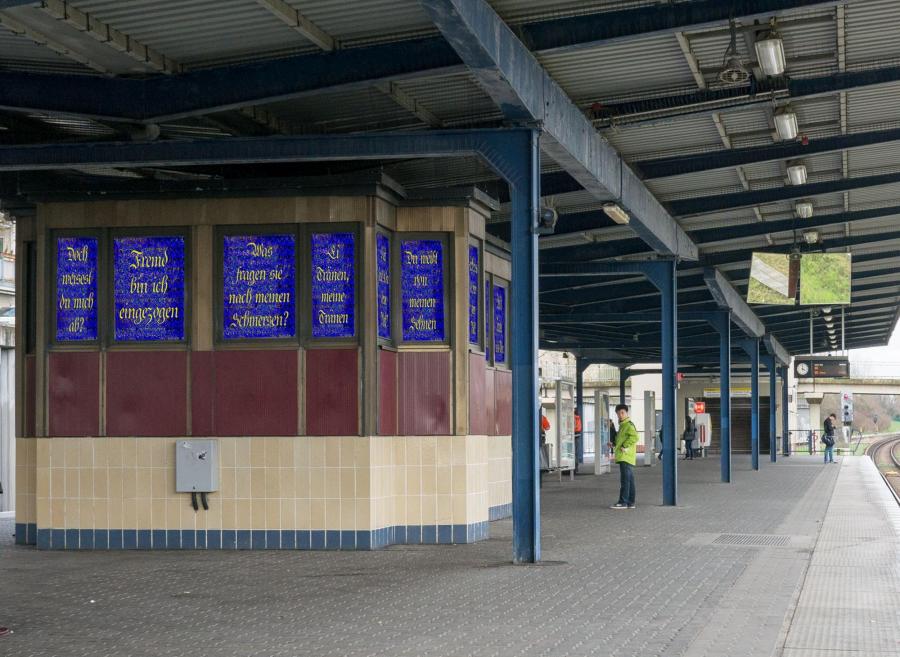 The text and background pattern will be installed in the windows of the station staff room on the platform at U-Bhf. Cottbusser Platz. The print is on transparent acrylic film allowing light to pass through from the inside of the staff room similar to light passing through stained glass.