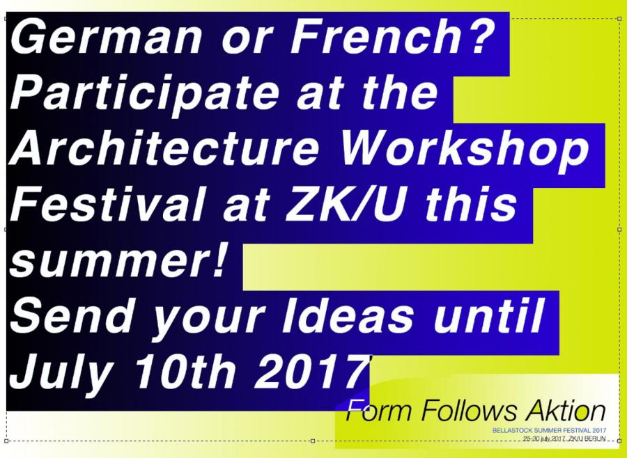 Saturday 29th of July from 4 pm, the Form Follow Aktion workshop will come to an end and opens to the public. See and experience how 70 young architects intervened on the ZK/U building structure. Lectures, workshops, Radio Programm, food and more followed by the FFA Party in ZK/U`s basement.