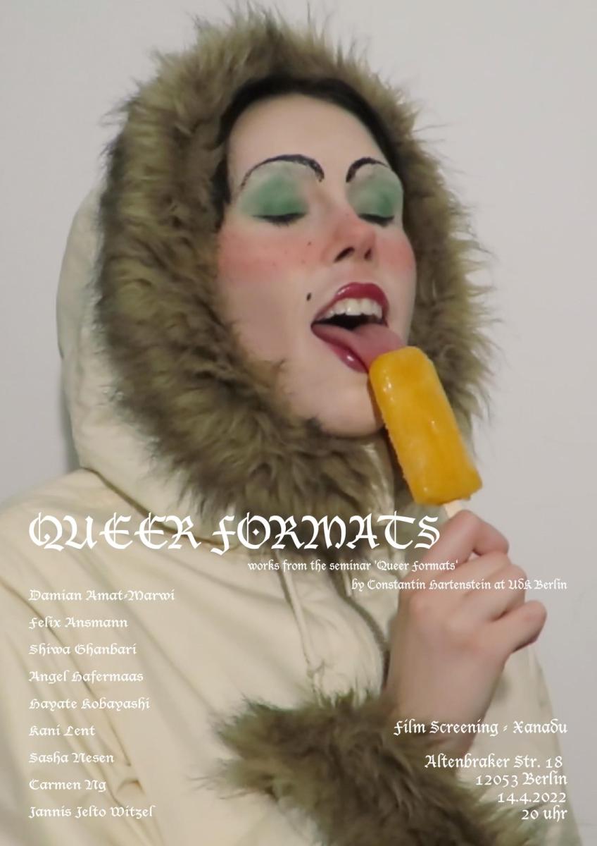 The identification of queer cinema probably emerged in the mid-1980s through the influence of queer theory, which aims to challenge and push further debates on gender and sexuality as developed by feminist theory and confuse binary essentialisms around gender and sexual identity, expose their limitations, and depict the blurring of these roles and identities. Queer Formats presents the resulting works of the eponymous seminar at UdK Berlin led by Constantin Hartenstein.