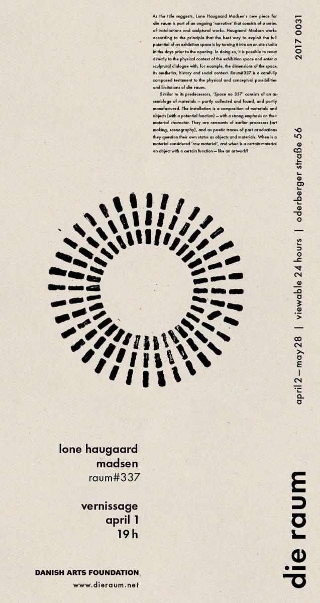 As the title suggests, Lone Haugaard Madsen’s new piece for die raum is part of an ongoing ‘narrative’ that consists of a series of installations and sculptural works. Haugaard Madsen works according to the principle that the best way to exploit the full potential of an exhibition space is by turning it into an on-site studio in the days prior to the opening. In doing so, it is possible to react directly to the physical context of the exhibition space and enter a sculptural dialogue with, for example, the dimensions of the space, its aesthetics, history and social context. Raum#337 is a carefully composed testament to the physical and conceptual possibilities and limitations of die raum.