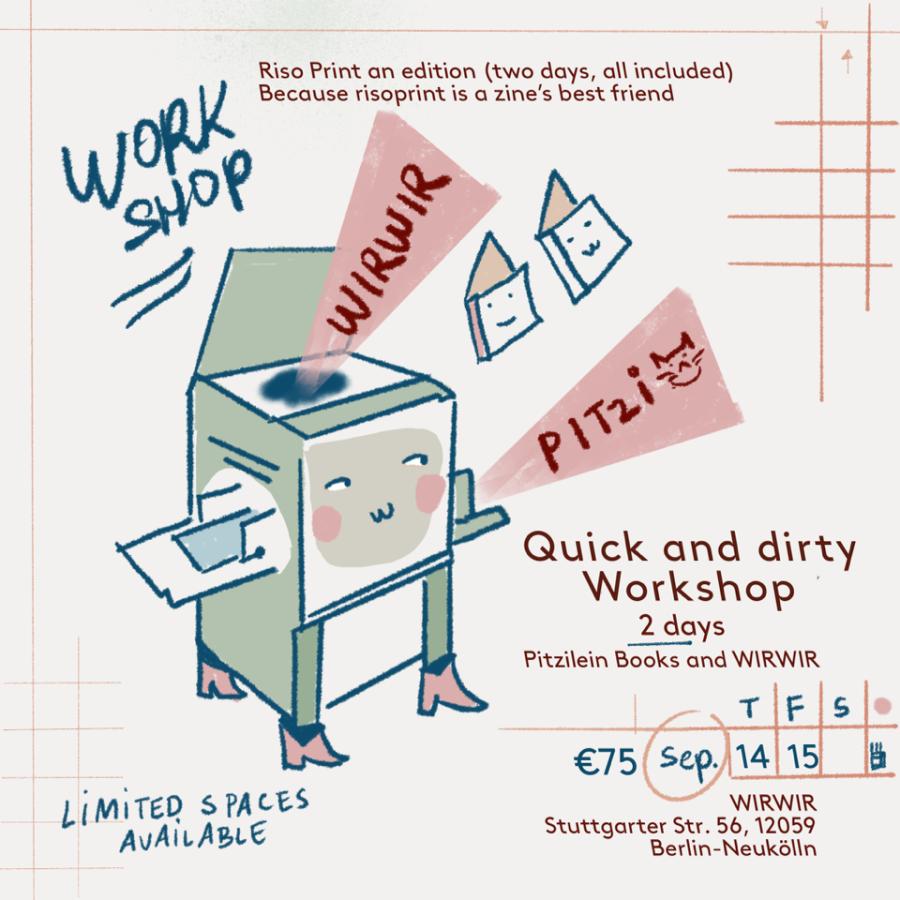 2 Day Risograph workshop; Quick and Dirty with Pitzilein Books from Mexico City. The workshop will cover the ins and outs of making an editioned Zine. Each participant will leave with 15 copies of their Zine at the end of the workshop. It is recommended that those who participate come to the workshop with an idea in mind already!