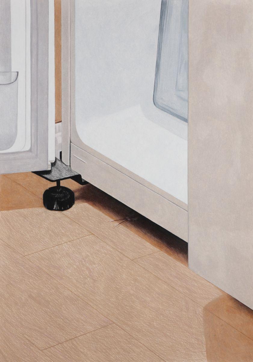 Quoting Diana Ross’ iconic hit It’s my house, Sangun Ho’s solo exhibition at soft power looks into the details that make up the surfaces of our everyday life. The romantic encounter of two pigeons on a sidewalk, an abandoned pillow comfortably resting on a window sill, a little dog peeking over the edge of the breakfast table, a bottle hiding out under the fridge – Sangun Ho captures lived and living moments that we all encounter every day. The artist collects and accumulates these fragments in a snapshot-like manner – halting their fleeting presence by giving each of them the focused attention needed to create his detailed hand drawings. As a body of work, the vast amount of these daily drawings seems to represent “the real world”, yet creating a world entirely of their own. Often captured in transit, on his way to the studio, coming home, leaving, Sangun Ho’s motives hint at the beauty inherent in the oddest of situations.