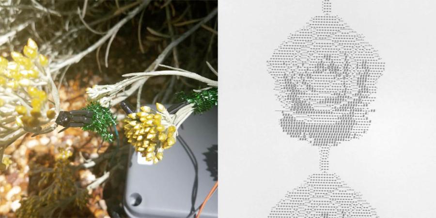 Plant-to-Plant Protocols with Sarah Grant is an unstable network of radios and IR sensor pairs attached to plants. It is a meditation on the aesthetics of data transmission and network disruptions caused by the natural movement of plants in response to light, wind, and other natural conditions. ASCII art data is transmitted in a loop between 12 networked devices and continuously printed out to a browser window once per iteration. A 13th device, a Raspberry Pi, pushes our ASCII data out to a public facing web page accessible to anyone with the link.