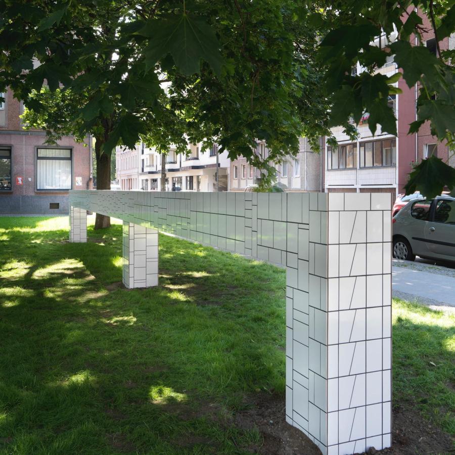 Popularis is the name of a group of sculptures made by Berlin artist #SimonMullan. (Tresen), which is the German word for “counter”, is the subheading for the newest work of this series, which the artist created specifically for the public green between Almstadt- and Rosa-Luxemburg-Straße where it will be staying for the next four months. Like all works of the series it is a simple geometrical shape fully covered in tiles – which in view of the suggested use seems rather practical.