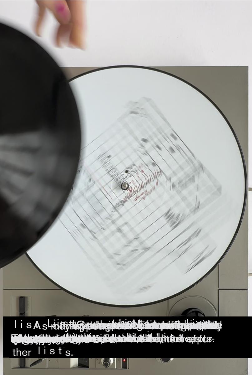Die drehende LP löst die quadratische Zeichnung auf. Deren räumliche Stabilität weicht einer durch die drehende LP initiierten Verwischung, die zu einer neuen Qualität von (Bild)Raum –