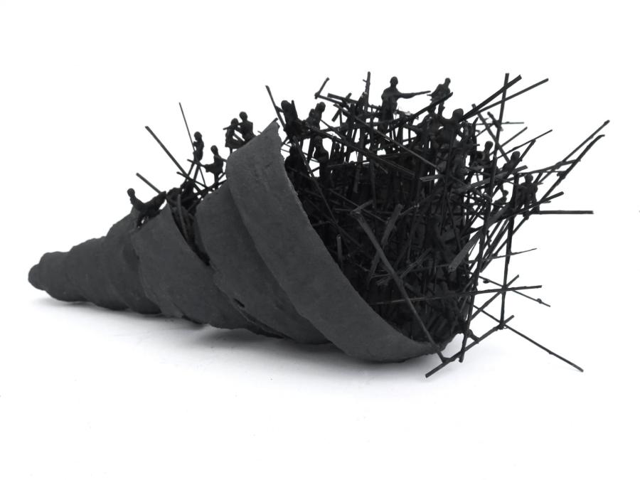 The tension between ruin and hope directs the tone of The Black Tower. At play here are two oppositional forces. On the one hand darkness, confinement and destruction, which come to the fore in Walid Siti’s wounded sculptural objects, such as for example the sculptural piece The Black Tower (2016) after which this exhibition is named. These objects, smothered in heavy black paint combine architectural and other kinds of wreckage with the iconography of war and repression: toy plastic soldiers, barbed wire, and scorched earth. Together they highlight the machinery of armed conflict and the expendability of human life. On the other hand, there is always Siti’s longing for betterment, which is manifested in the returning visual trope of ladders, mountains, ziggurats and staircases. Installations such as Joined Ladder (2016), a white floor-to-ceiling open-ended ladder consisting of smaller ladders, and Passage (2016), a pigment print showing a close-up of a photograph the artist had taken of a cliff in Kurdistan emphasise movement, escape and possibility.