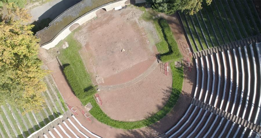 The cinematic approach to these sites is done from the air. With a camera drone a trip is started vertically above the Thingplatz, you can see the whole environment, the camera slowly approaches, it turns around its own axis until the square fills the picture. The image spinning like a spiral creates a suction. It is a figurative expression of the seduction and agitation of the population by National Socialism.