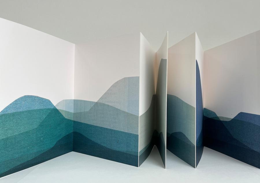 "Waves of delicate curves rise and fall on white paper pages in colors ranging from deep blue to pale azure. Changing in form and intensity, in variations and repetitions, the waves set a visual rhythm reminiscent of both the structures of a musical score and a tide chart. However, there is no emptiness here, no ebb. The overlapping, simultaneous tidal representations of several coasts and seas unite several imaginary landscapes into a never-ending, moving tide, a permanent presence.