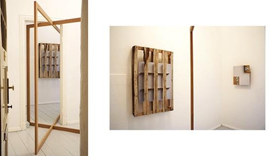 The white wall is a convention of display and as such an essential motif in Barbara Wille's photographic inlays. Photographs of the white wall are combined with the heavily-grained surface of wood from a pallet which is set into the image. There, it occupies the place of previously photographed models. The gesture of exhibiting is thus already anticipated as motif. Depending on the light and the materiality of the models, and depending on what else is in the room, the wall may appear on the photographs as an atmospheric, lively-textured white, on which the models throw multiform shadows in differentiated colour. Everything is incl uded in these shadows, which thus reflect the room and its objects. Hence Barbara Wille's photographic inlays already originate in part from the sphere of the image. By combining photographic surfaces with real objects, a tautological construct creates the perception of hyperrealism: the wood of the pallet appears very sharp and brilliantly portrayed. The difference in scale and the relationship between the light in the image and in the room opens up surprising perspectives on the plasticity of what is seemingly portrayed. The thing becomes what it shows: a wall-mounted, pallet-like construction. And although one sees immediately through the nature of the work, one desires deception. A photographic tromp l'oeil.
