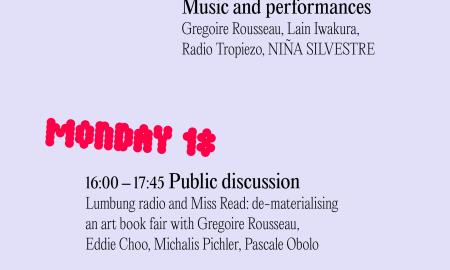 Miss Read pre-fair program18.09.2023, 18h Dj Set Lesbinario - This 19.09.23 Station of Commons Gregoire Rousseau, Eddie Choo Wen Yi 14:00 - 16:00 Public discussion on online... | 18 Sep-21 Sep | read more |