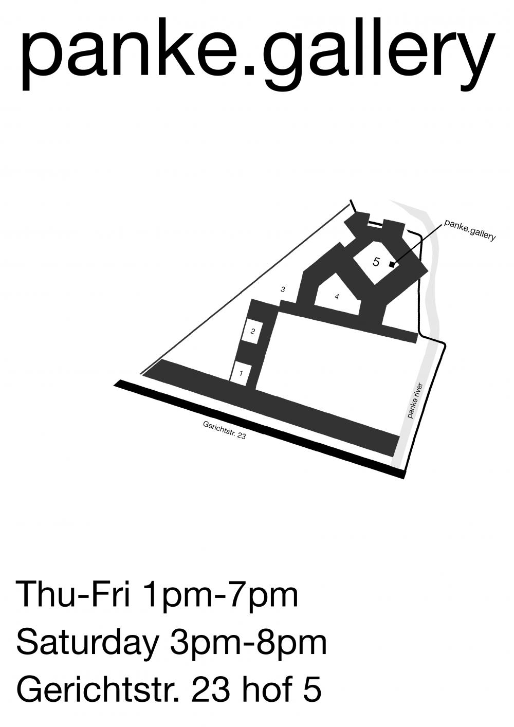 During exhibitions Thu, Fri 1 pm - 7 pm and Sat 3 pm - 8 pm and for special events. Outside exhibition dates on request, please contact us: info [at] panke.gallery